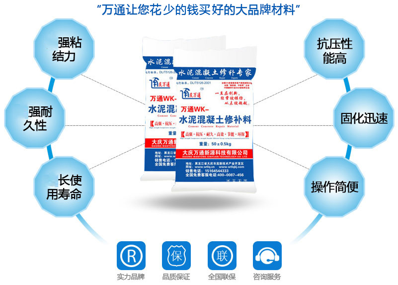 大慶萬通新源科技有限公司獨(dú)有的混凝土路面高強(qiáng)速補(bǔ)料,是水泥混凝土路面病害修復(fù)的好材料。疲勞、凍融循環(huán)、彎曲壓力、滲水和基層破壞等原因都會引起水泥路面的破損,從而帶來高昂的維護(hù)費(fèi)用。與以往的剛性修補(bǔ)方法不同,混凝土水泥路面維修速補(bǔ)膠提供了一種獨(dú)特的柔性修補(bǔ)產(chǎn)品和技術(shù),高柔性、高抗拉性,可跨伸縮縫施工和高抗壓性使得混凝土快補(bǔ)產(chǎn)品為水泥混凝土路面提供了******性的修補(bǔ)。傳統(tǒng)的剛性修補(bǔ)方案,如環(huán)氧砂漿和快干水泥產(chǎn)品,由于其自身的粘結(jié)失效,抗疲勞性低以及與原路面不同的伸縮系數(shù),修補(bǔ)面會在短時間內(nèi)失效或產(chǎn)生新的裂縫,需要反復(fù)修補(bǔ),有效期短且費(fèi)用高昂。大慶萬通新源科技有限公司的混凝土水泥路面維修速補(bǔ)膠可以隨原路面一起伸縮,移動,從而避免了粘結(jié)失效和產(chǎn)生新裂縫。萬通快補(bǔ)產(chǎn)品優(yōu)異的粘結(jié)性、柔韌性和高防滑性,特別適用于水泥路面的淺層粘合修補(bǔ),多邊角混凝土板層修補(bǔ),跨伸縮縫修補(bǔ)以及路面沉陷修補(bǔ)。萬通混凝土病害修補(bǔ)料針對混凝土起皮起沙、斷板裂縫、蜂窩麻面、坑槽露石子、漏筋掉皮、橋梁的掉皮漏筋快速通車使用時間長。應(yīng)用萬通快補(bǔ)產(chǎn)品,施工后一天就可以恢復(fù)交通。大慶萬通新源科技有限公司的萬通水泥路面維修速補(bǔ)膠適用于高速公路、機(jī)場路面、農(nóng)村村村通路面、廠坪、學(xué)校操場、市區(qū)公路、小區(qū)路面、橋梁、水泥路面的修補(bǔ)。使用萬通特快補(bǔ)材料修補(bǔ)路面可以一勞永逸! 水泥地面起砂怎么辦,混凝土修補(bǔ)劑混凝土地面起砂,混凝土地面修補(bǔ),地面起砂怎么辦,